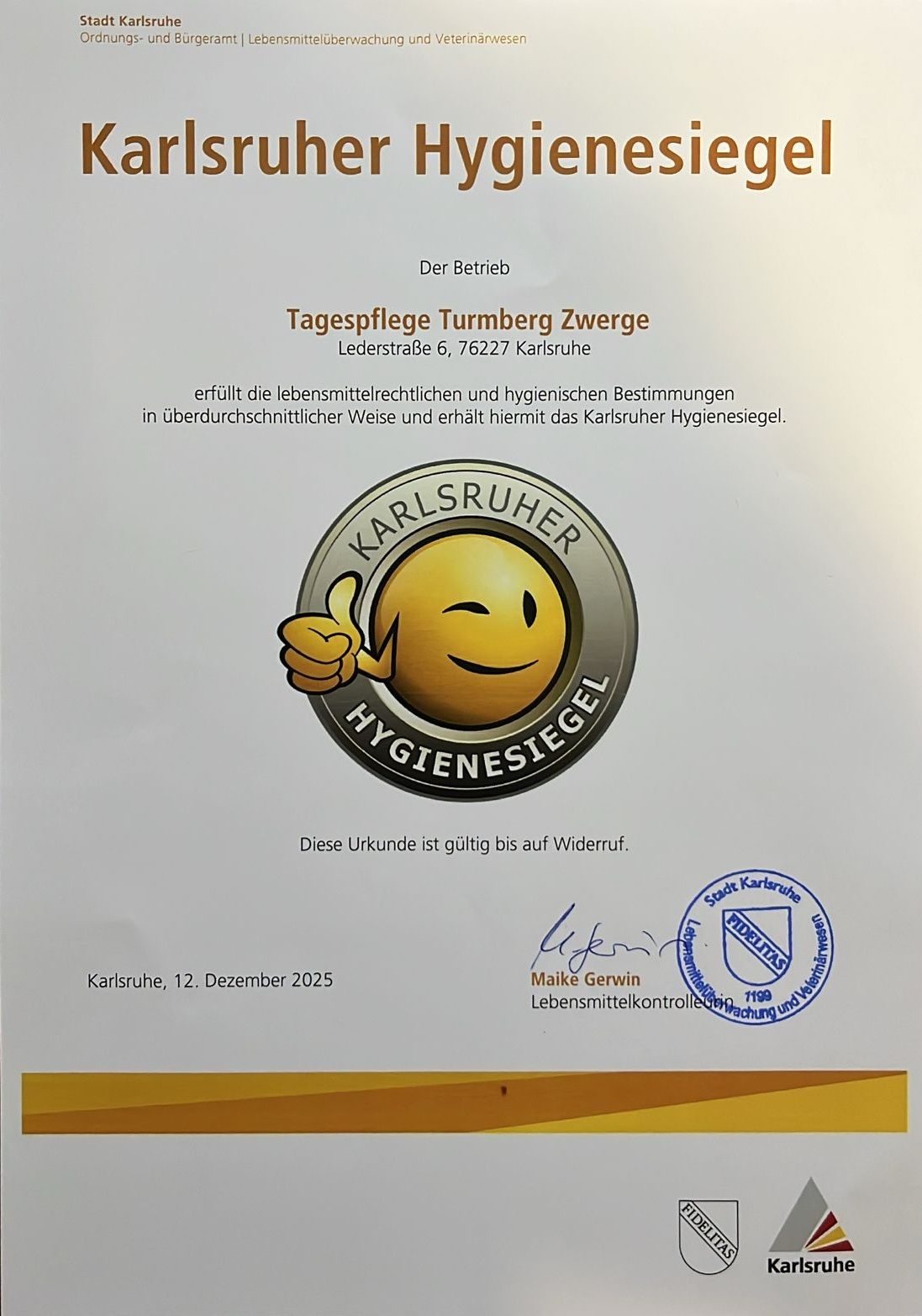 Hygiene ist uns wichtig! Die Turmberg Zwerge sind mit dem Karlsruher Hygienesiegel ausgezeichnet worden.